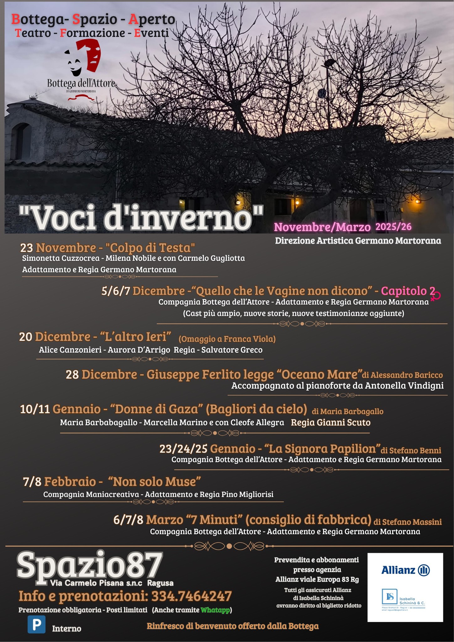 INFO E PRENOTAZIONI: 334 7464247 (anche WhatsApp). Prevendite e abbonamenti presso Allianz – Viale Europa 83, Ragusa Tutti gli assicurati Allianz Isabella Schininà hanno diritto al biglietto ridotto