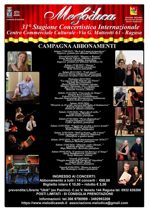 Domenica 30 novembre, alle 20.30 (apertura pubblico ore 20.00), l’Auditorium del Centro Commerciale Culturale #CCC di #Ragusa apre le sue porte a un viaggio nella Sicilia più intima e autentica: "𝑳𝒂 𝒄𝒂𝒏𝒛𝒐𝒏𝒆 𝒅𝒆𝒍𝒍𝒂 𝑷𝒂𝒍𝒆𝒓𝒎𝒐 𝒅𝒆𝒊 𝑭𝒍𝒐𝒓𝒊𝒐" con il Vucidda Duci Ensemble, nuovo appuntamento di #Melodica31.