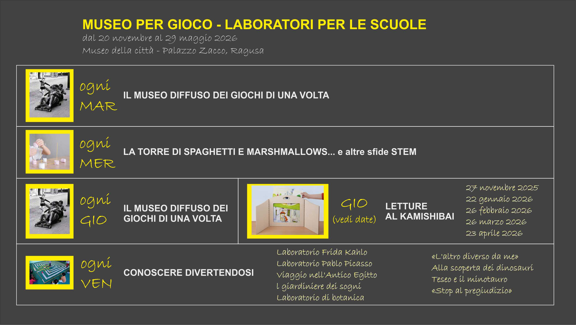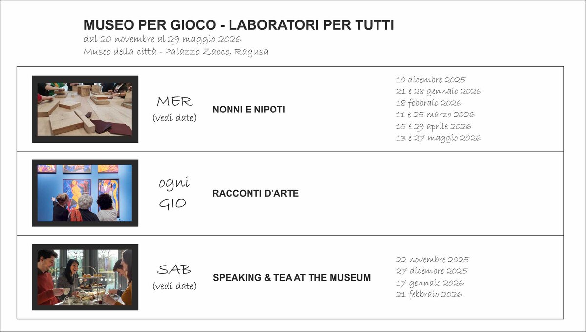 Museo per Gioco è un programma di laboratori per scuole, per famiglie, per tutti che, in continuità con lo scorso anno, entreranno stabilmente e in maniera continuativa all’interno della programmazione museale per l’anno 2025-2026. Un'iniziativa congiunta degli assessorati alla Cultura e alla Pubblica Istruzione per vivere la storia di Ragusa in maniera interattiva e coinvolgente.