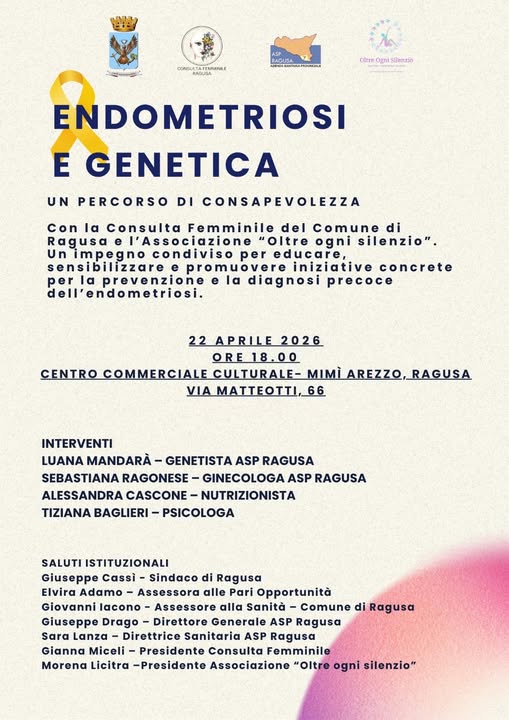 In occasione della Giornata nazionale della salute della Donna, la Consulta Femminile del Comune di Ragusa promuove, insieme all’Associazione “Oltre ogni silenzio” e in collaborazione con l’assessorato alle Pari Opportunità, un’importante iniziativa di informazione e sensibilizzazione dal titolo “Endometriosi e genetica – Un percorso di consapevolezza”, in programma il prossimo 22 aprile alle ore 18.00 presso il Centro Commerciale Culturale “Mimì Arezzo”.